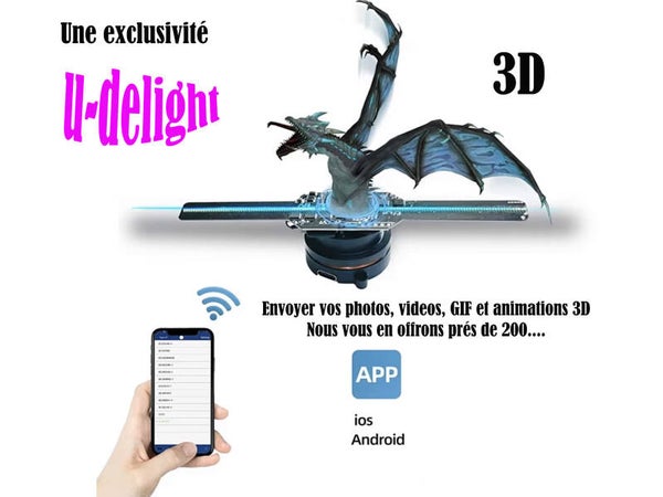 Voici le modèle de ventilateur holographique qui est parfait pour se positionner par exemple sur un pot de fleur pour faire apparaitre des papillons, des oiseaux, des plantes des insectes. C’est pour cela que nous vous offrons des animations spécialement réalisés pour la décoration.